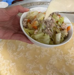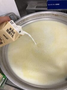 ③牛乳を加え、しょうゆと塩で味をつける。
