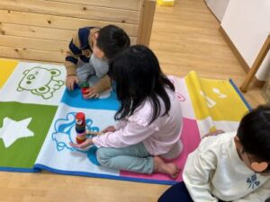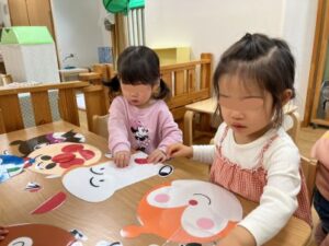 「もう少し右だよ」「そこそこ!」と声を掛け合いながら友だちと一緒に完成を目指す姿が見られました。「もっとこっちだよ」ともどかしくなって友達の手をそっと誘導してしまっている姿もかわいらしかったです。
