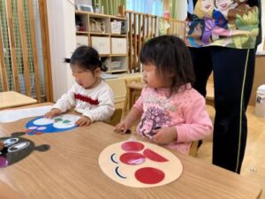 顔のパーツを手に取って触ったり顔に置いたりしながら、完成した顔を見るとニッコリ。「あれもやる!」と次々に楽しんでいました。