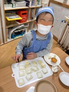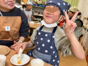 保護者に「これ食べていいよ!」と作ったものを差し出し、「おいしいよ」と言われると、どこか恥ずかしそうにしながらも嬉しそうでした。